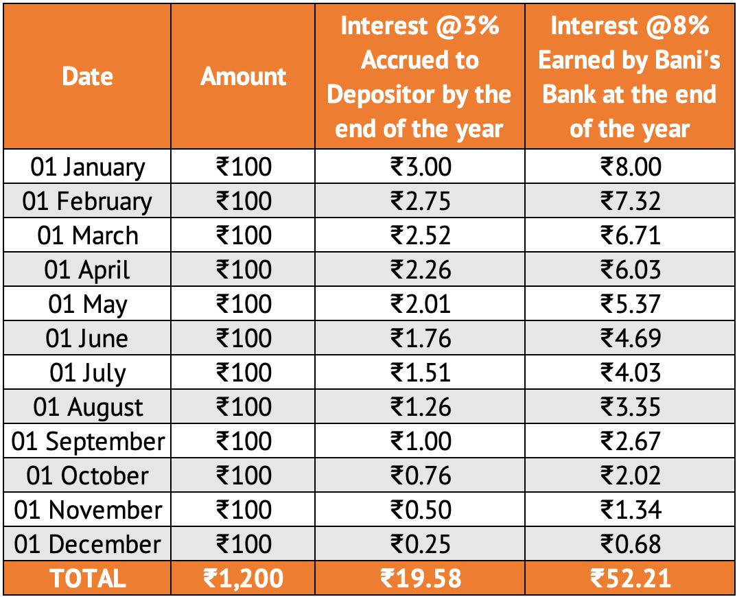 On her first day at the office, Y makes a deposit of ₹100. The bank promises them an interest of 3% for the year. On the 365th day, Bani's Bank would owe Y ⇒ ₹100 of the principal and ₹3 as interest. Total, ₹103.
