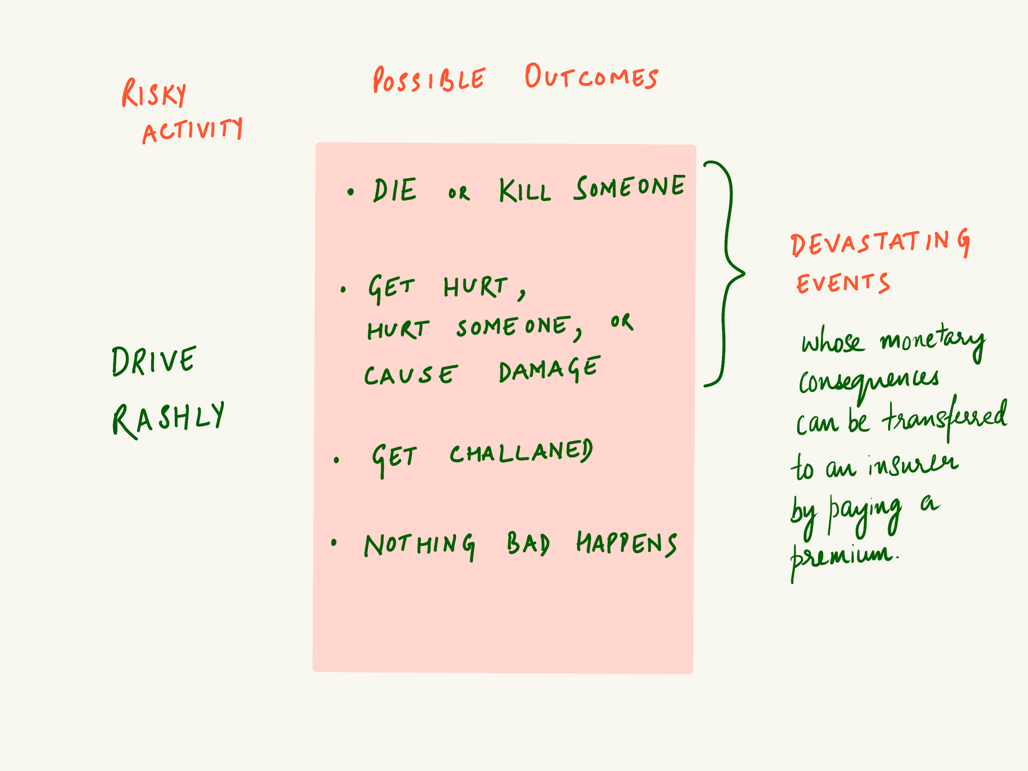 These risky actions can have various outcomes, with varying probabilities of transpiring. Some people drink, and drive back home every weekend. Others do it one time, and die in a car crash.
