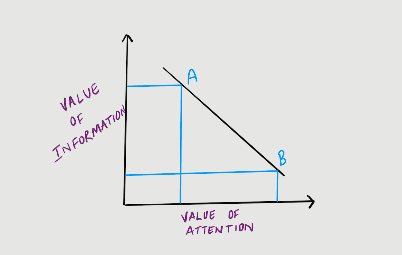 At point A, one can see that the value of information is high, while the value of attention is low. This depicts the pre-internet times. When the supply of information was much lower than people's appetite for it.